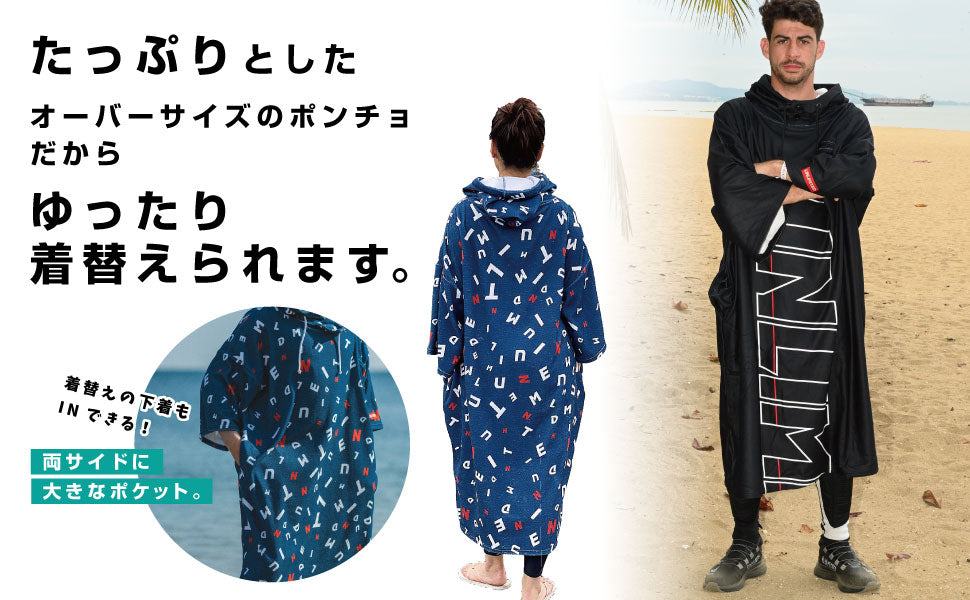左右の大型ポケットはビーチや外での着替えにとても便利です。
