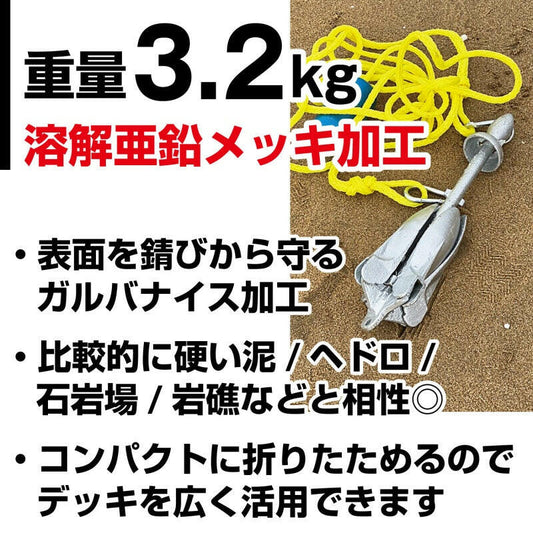 ホールディング アンカー 3.2kg 溶解亜鉛メッキ加工 フォールディング アンカー ボート ジェットスキー 錨 いかり 1503