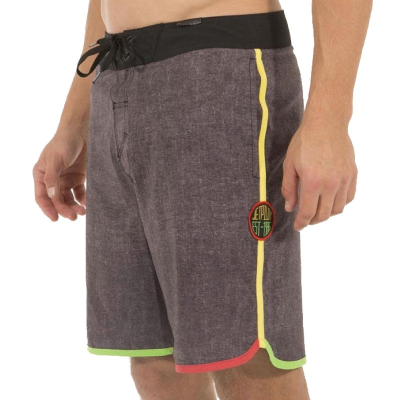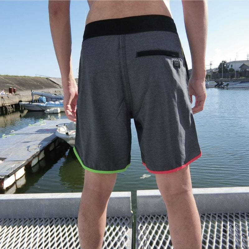 ストレッチ素材ベースにアクセントのパイピングとシンプルなロゴパッチ仕上げのボードショーツ。