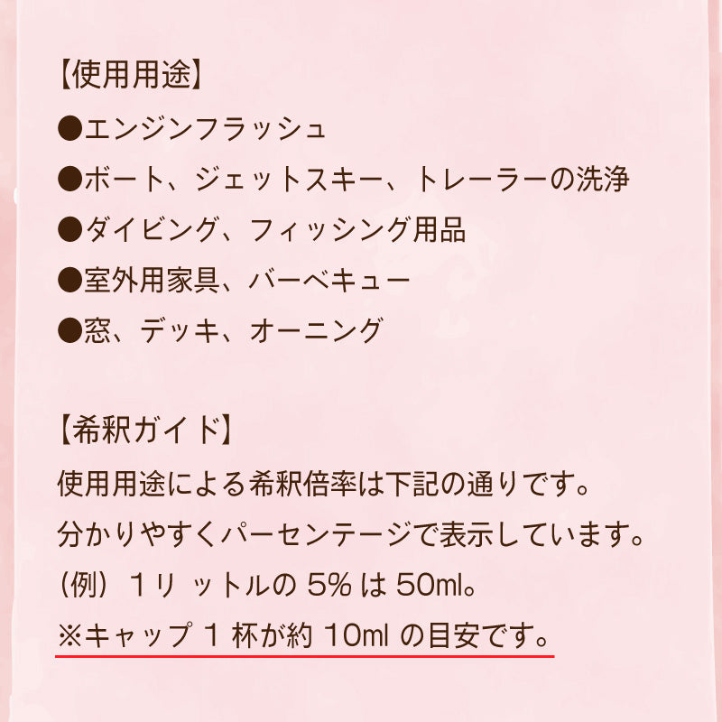 When used to wash PWC and boat engines, it cleans, purifies and helps prevent salt build-up, inhibiting engine rust.