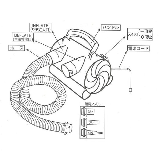 Adapter (for Achilles), storage bag, instruction manual*With 9 types of nozzle attachments, it can be used on most boats such as Achilles, Joycraft, Zodiac, etc.