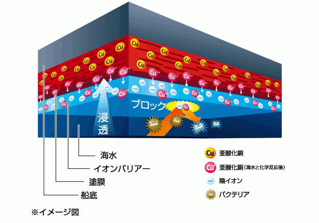●The anion barrier allows antifouling ingredients containing cations to be drawn out naturally and evenly to the surface. Cuprous oxide, which has become cationized by the infiltration of seawater, is attracted to anions.